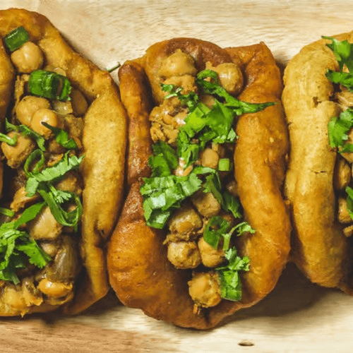 Chickpea bread with sautéed chickpeas, cilantro, green onion, and a homestyle tamarind sauce.