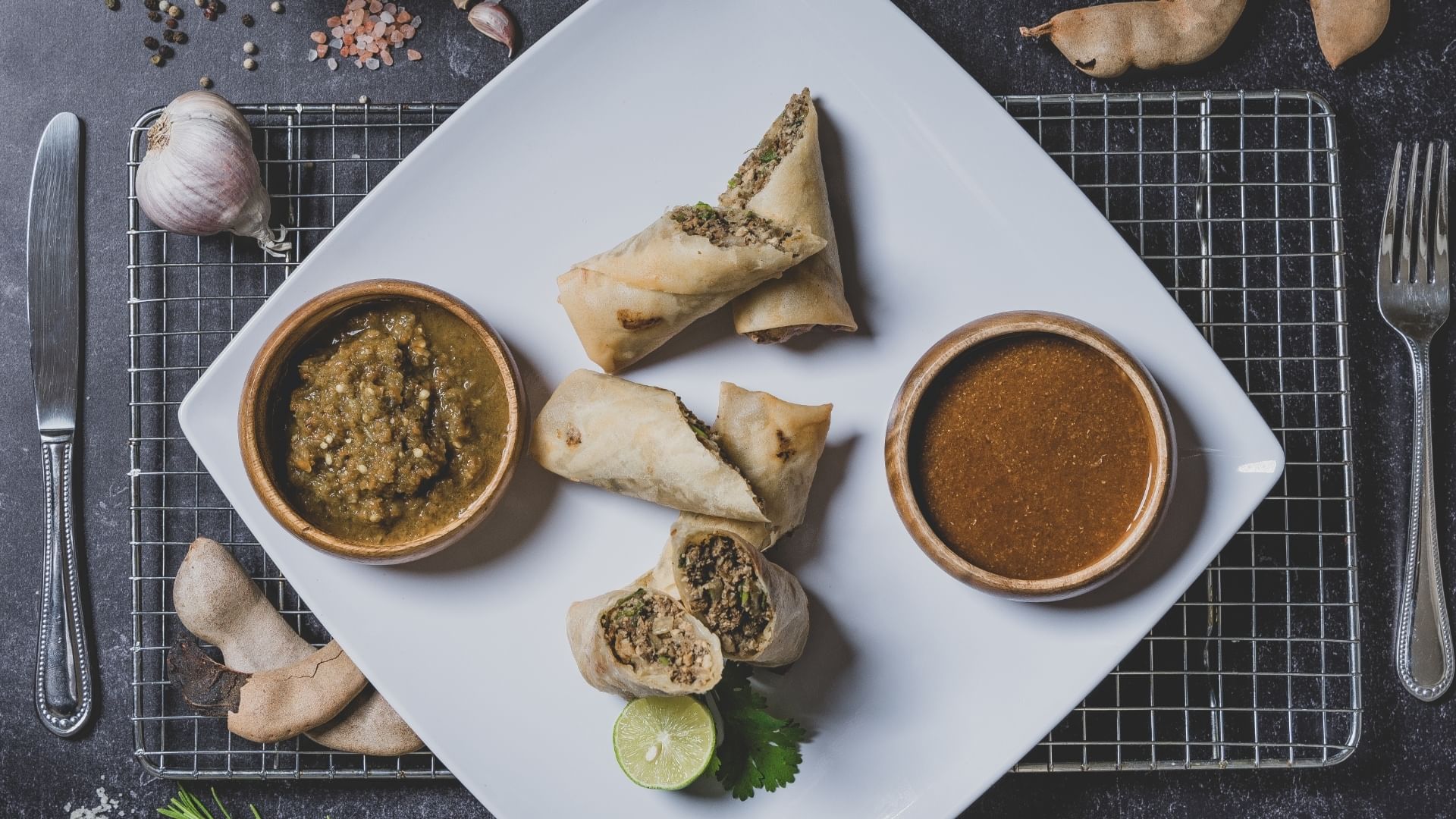 Chopped jerk halal chicken with onions and herbs rolled in a wheat wrap with a homestyle tamarind sauce