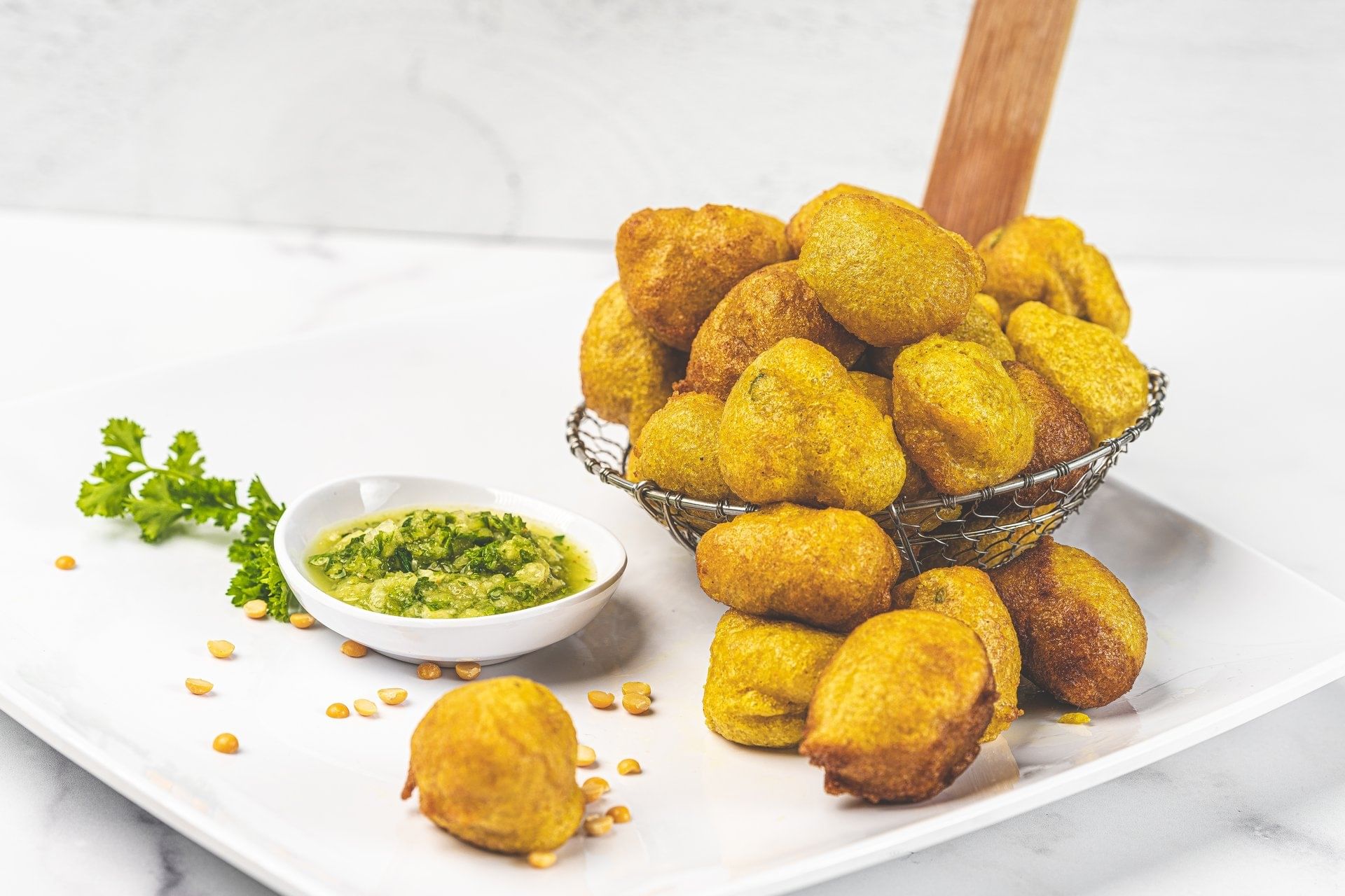 Qty. (10) - Enjoy our fluffy and savory fritters made with split peas, flour, herbs, and spices served with our homestyle cucumber and mango chutney sauce.