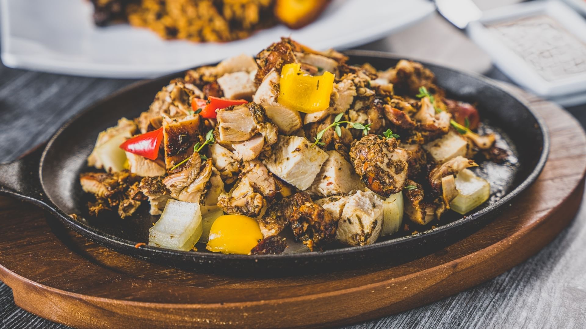 Bold, smoky jerk chicken layered with a colorful trio of green, red, and yellow peppers, bringing vibrant island flavor and just the right amount of heat to every bite.