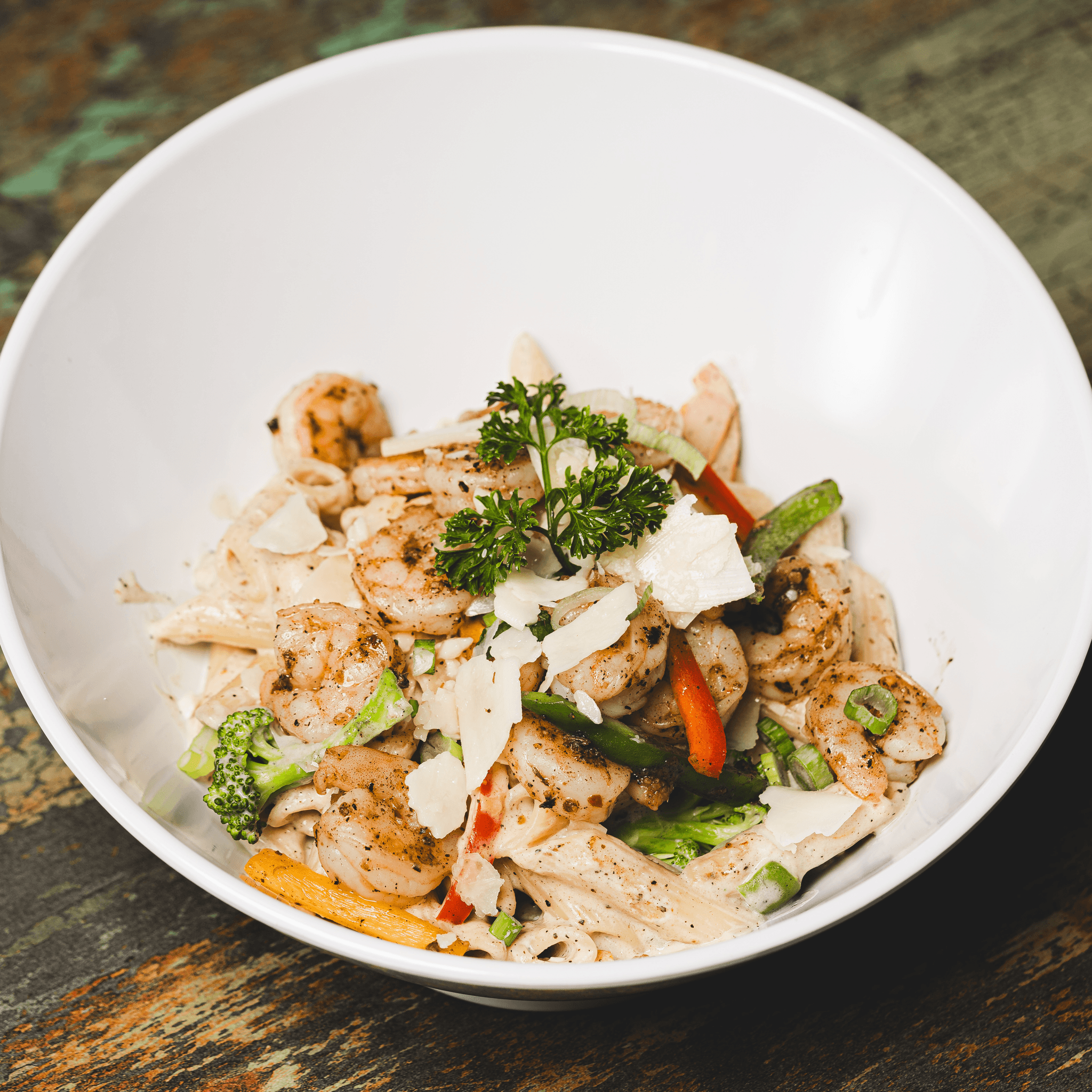 Juicy jerk-marinated chicken grilled to perfection, combined with vibrant tri-color peppers and creamy pasta in our signature spicy jerk cream sauce. A bold balance of heat, flavor, and island soul.
