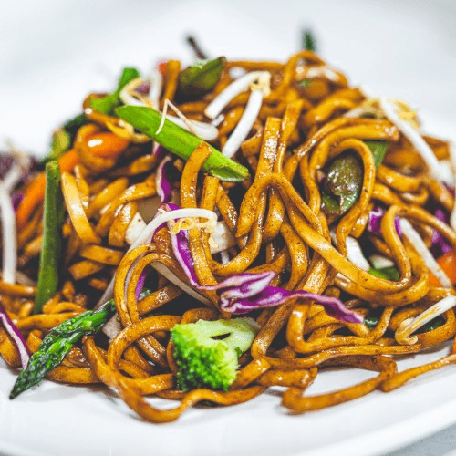 Lo Mein noodles with mixed vegetables sautéed in a savory garlic and ginger sauce.